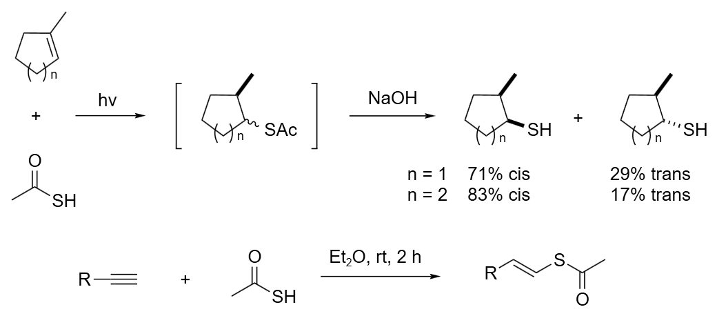 硫代乙酸與烯烴可以發(fā)生自由基加成,生成相應(yīng)的乙酸硝基硫醇酯類化合物。該加成反應(yīng)具有一定的立體選擇性,主要生成順式乙酸硫醇酯。但其不很穩(wěn)定,水解得到相應(yīng)的硫醇類化合物。硫代乙酸與炔烴可以發(fā)生自由基加成,生成相應(yīng)的乙酸烯基硫醇酯類化合物。硫代乙酸發(fā)生自由基加成時(shí),加入自由基引發(fā)劑或在光照條件下進(jìn)行可以提高產(chǎn)率。使用非對稱的烯烴和炔烴作為底物時(shí),該加成反應(yīng)都具有一定的區(qū)域選擇性。由于是自由基加成機(jī)理,該反應(yīng)主要生成反馬氏產(chǎn)物。