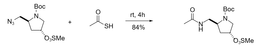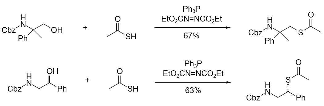 在 Ph?P 和 EtO?CN=NCO?Et 存在下,該試劑與各種伯醇和仲醇發(fā)生,Mitsunobu 反應(yīng)生成乙酸硫醇酯。當(dāng)光學(xué)活性的仲醇時(shí),可以得到構(gòu)型翻轉(zhuǎn)的酯。得到的酯還可以進(jìn)一步水解,生成相應(yīng)的硫醇或氧化成相應(yīng)的磺酸衍生物。