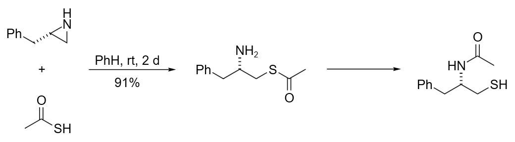 硫代乙酸還可以作為親核開環(huán)試劑對三元雜環(huán)發(fā)生開環(huán)反應(yīng),得到鄰位雙官能團(tuán)化合物。例如:硫代乙酸與氮雜環(huán)丙烷反應(yīng),首先得到開環(huán)產(chǎn)物鄰氨基硫醇的乙酸酯。然后,不穩(wěn)定的酯馬上原位發(fā)生分子內(nèi)酰基遷移反應(yīng),生成 N-乙酰基氨基硫醇。