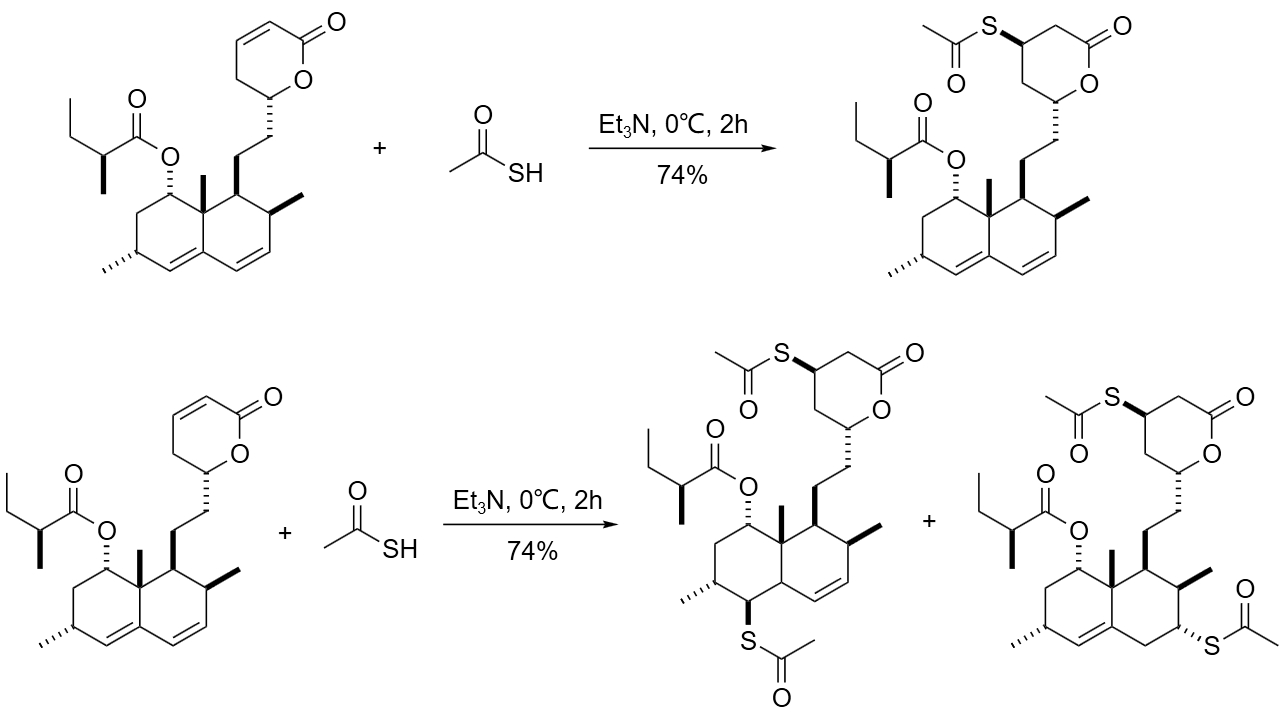 硫代乙酸與 α,β-不飽和羧酸內(nèi)酯發(fā)生加成反應(yīng),得到相應(yīng)的乙酸硫醇酯類化合物,當(dāng)硫代乙酸過量時(shí),過量的硫代乙酸還將進(jìn)一步與分子中的二烯發(fā)生 1,4-加成反應(yīng)得到相應(yīng)的雙乙酸硫醇酯類化合物,硫代乙酸與二烯發(fā)生的 1,4-加成反應(yīng)屬于自由基加成。