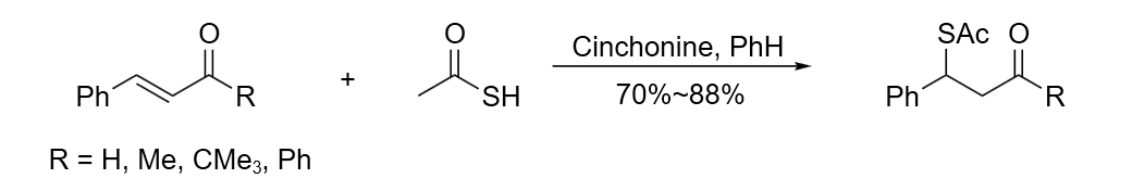 硫代乙酸應(yīng)用最廣的是作為 Michael 給體,與不同的 Michael 受體發(fā)生共軛加成反應(yīng)。例如:與 α,β-不飽和醛酮、醌、羧酸及其衍生物酯和酰胺、硝基烯烴等都可以發(fā)生加成反應(yīng),得到相應(yīng)的乙酸硫醇酯類化合物。硫代乙酸與 α,β-不飽和醛酮發(fā)生加成反應(yīng),得到相應(yīng)的乙酸硫醇酯類化合物。